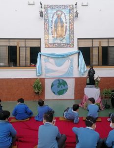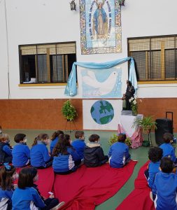 El acto central que unió a todo el Colegio tuvo lugar en el patio, donde realizamos peticiones de perdón, reflexionamos las Bienaventuranzas a la luz del Evangelio, cantamos y leímos un manifiesto y un decálogo para crecer en Paz. Un mural, formado por una paloma y nuestro planeta, sirvió para recoger los compromisos personales por la Paz de todos los alumnos.