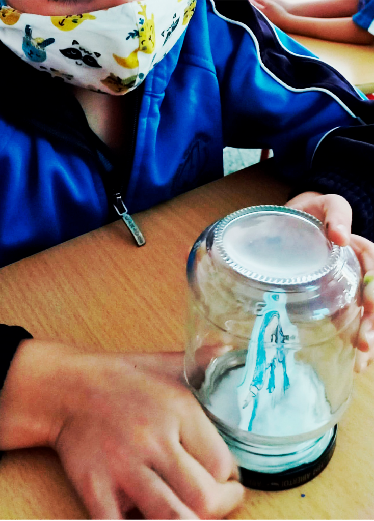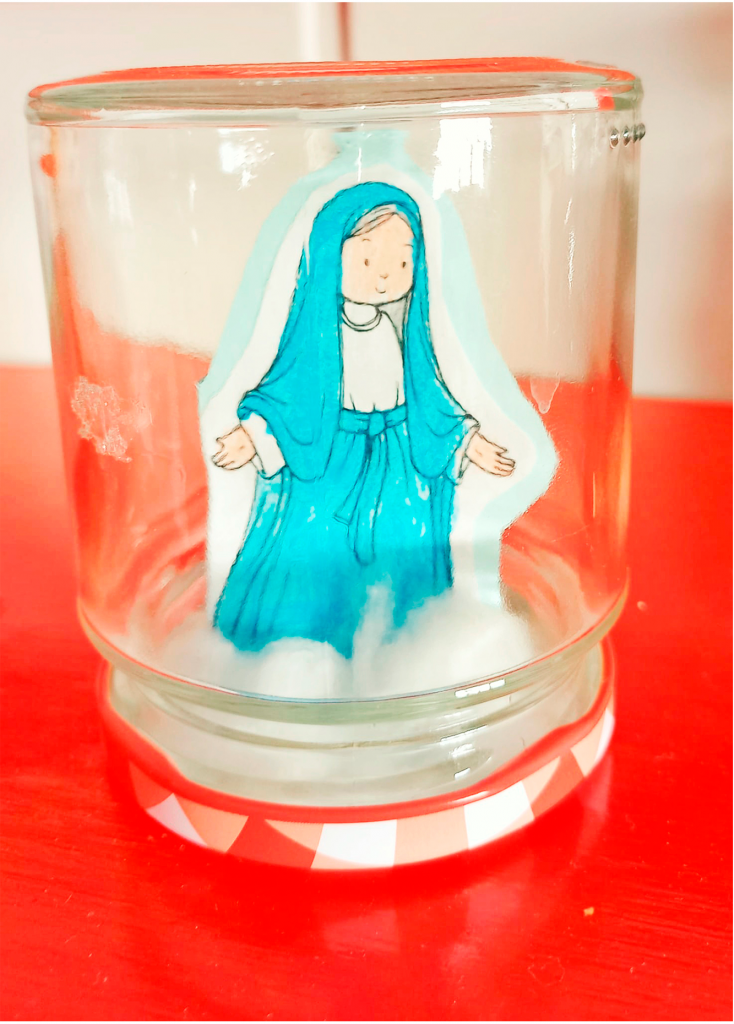 Siguiendo nuestro objetivo de hacer un colegio más sostenible y concienciado con el medio ambiente, los materiales que hemos utilizamos son, entre otros, botes reciclados de cristal de conservas o mermeladas, algodón y cartulina. Es un proyecto sencillo y es nuestro homenaje a la Virgen de cara a la próxima festividad.