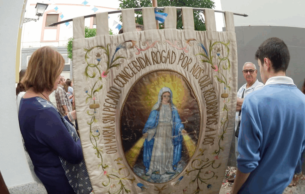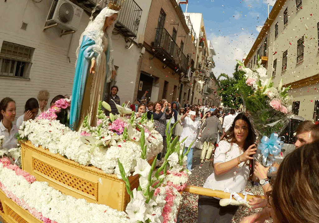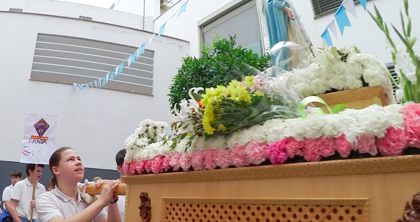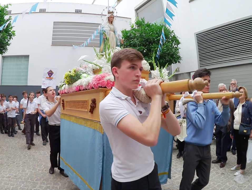 Durante el recorrido, el paso será portado por alumnos de Secundaria, acompañados por los más pequeños, que formarán parte del cortejo ataviados para la ocasión, con flores, estandartes y cantos en honor a la Virgen, y nuestra banda de tambores.